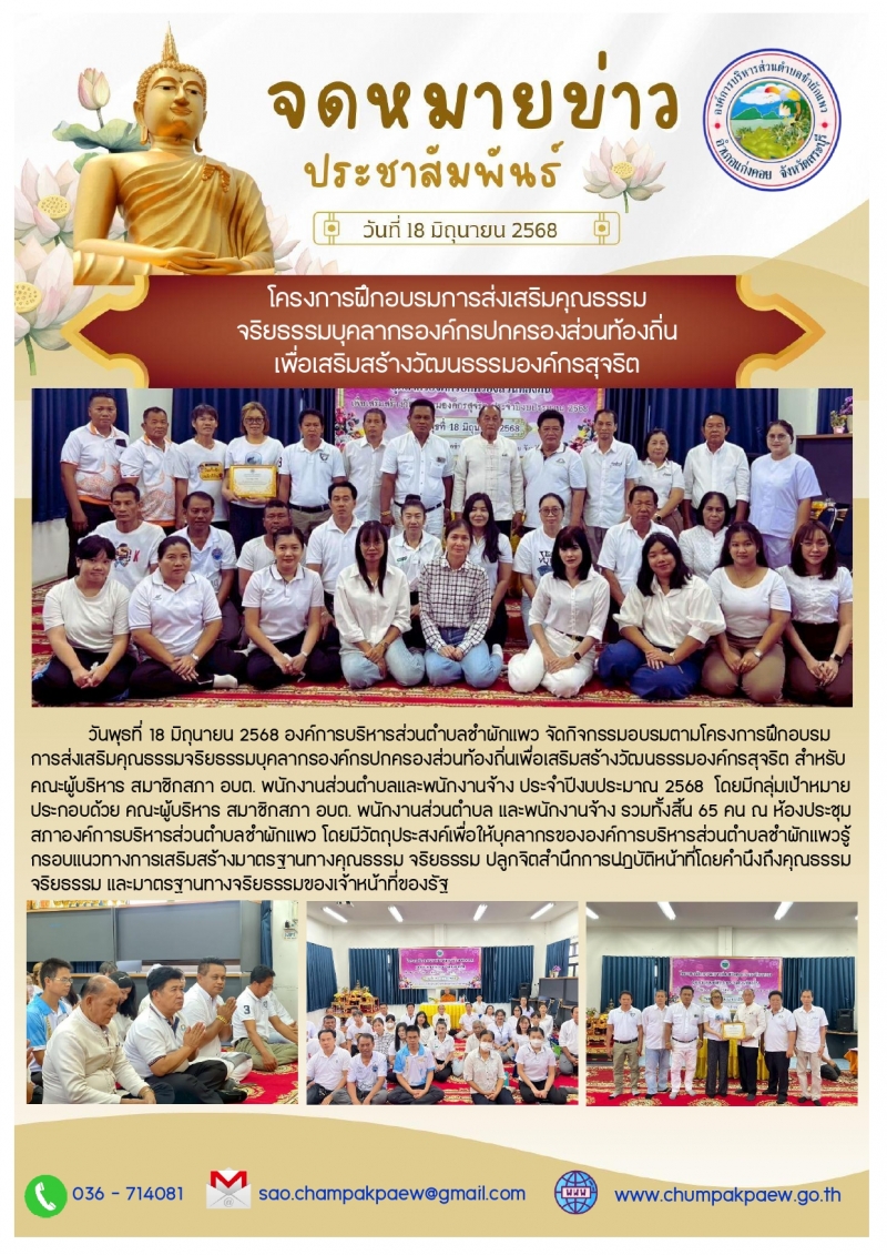 วันพุธที่ 18 มิถุนายน 2568 องค์การบริหารส่วนตำบลชำผักแพว จัดกิจกรรมอบรมตามโครงการฝึกอบรมการส่งเสริมคุณธรรมจริยธรรมบุคลากรองค์กรปกครองส่วนท้องถิ่นเพื่อเสริมสร้างวัฒนธรรมองค์กรสุจริต สำหรับคณะผู้บริหาร สมาชิกสภา อบต. พนักงานส่วนตำบลและพนักงานจ้าง ประจำปีงบประมาณ 2568 โดยมีกลุ่มเป้าหมายประกอบด้วย คณะผู้บริหาร สมาชิกสภา อบต. พนักงานส่วนตำบล และพนักงานจ้าง รวมทั้งสิ้น 65 คน ณ ห้องประชุมสภาองค์การบริหารส่วนตำบลชำผักแพว โดยมีวัตถุประสงค์เพื่อให้บุคลากรขององค์การบริหารส่วนตำบลชำผักแพวรู้กรอบแนวทางการเสริมสร้างมาตรฐานทางคุณธรรม จริยธรรม ปลูกจิตสำนึกการปฏิบัติหน้าที่โดยคำนึงถึงคุณธรรม จริยธรรม และมาตรฐานทางจริยธรรมของเจ้าหน้าที่ของรัฐ