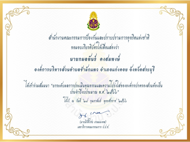ประกาศเกียรติคุณ องค์การบริหารส่วนตำบลชำผักแพว ๓ ไร้ทุกข์ ๕ สร้างสุข